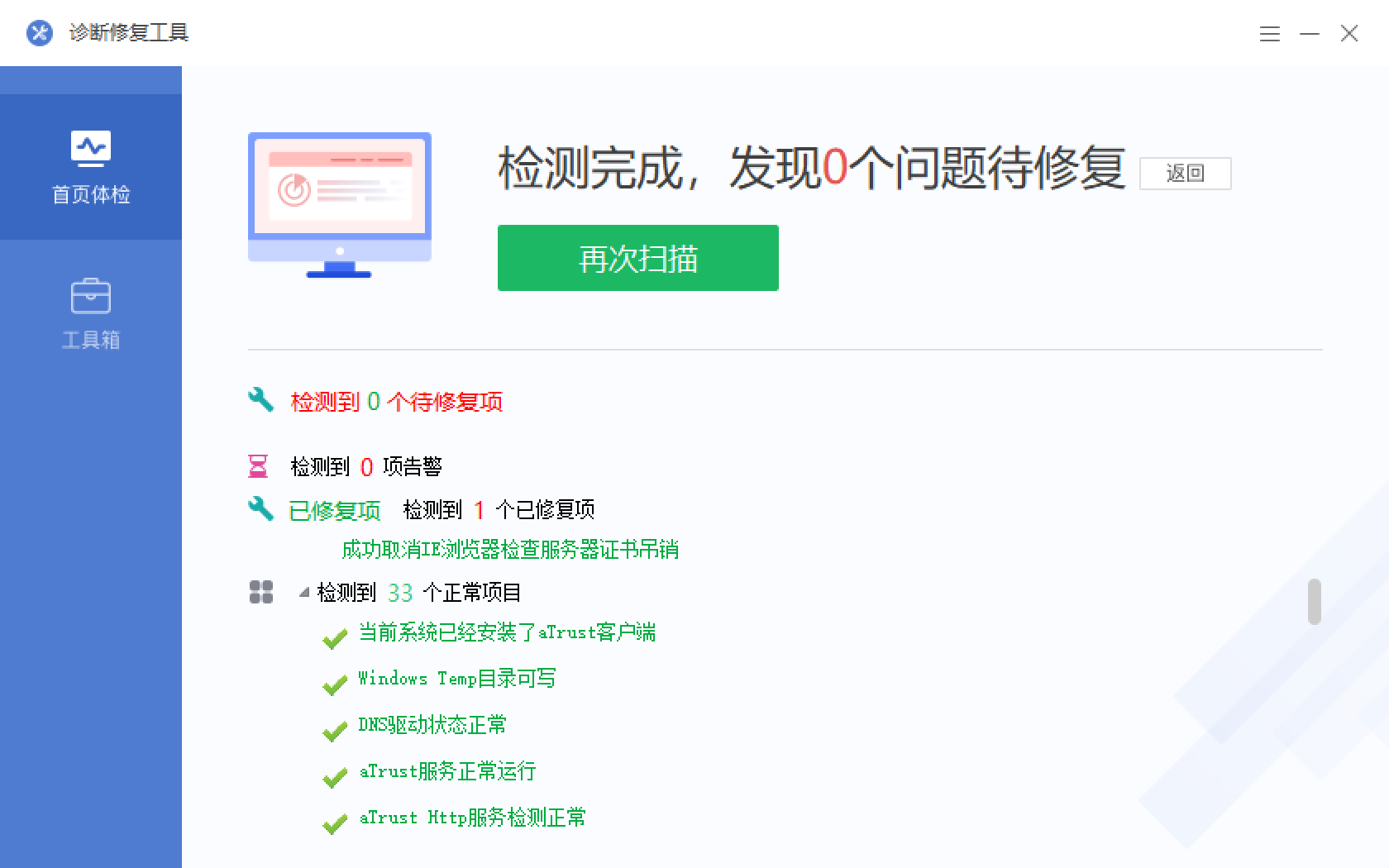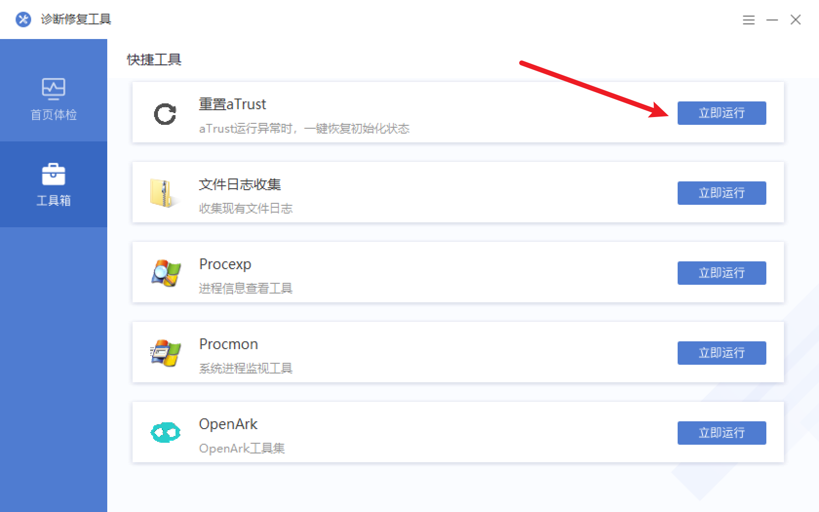 7. 如果还是不能登录,点击“工具箱”,点击“重置aTrust”。重置完成后再进行登录访问。
