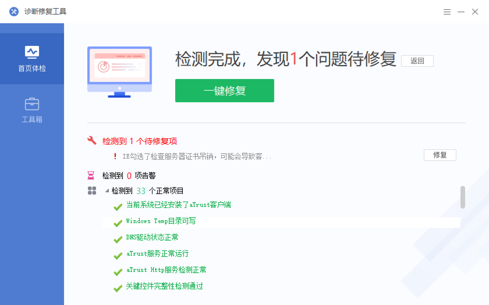 5. 扫描完成后,如有故障,点击一键修复