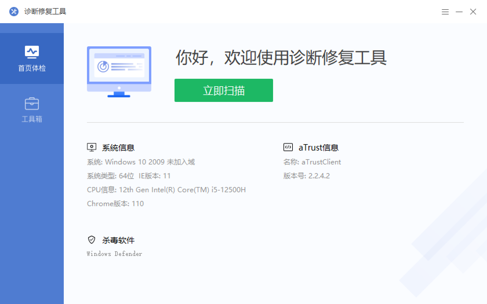 4. 打开诊断工具,点击立即扫描。