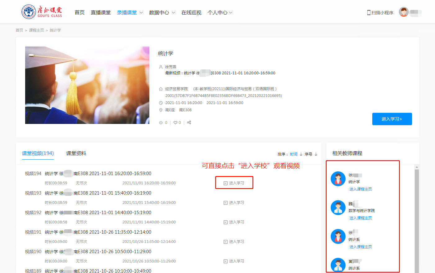 (3)进入课程主页后,点击“进入学习”即可观看视频,也可查看相关课程的老师,显示的页面如下图: