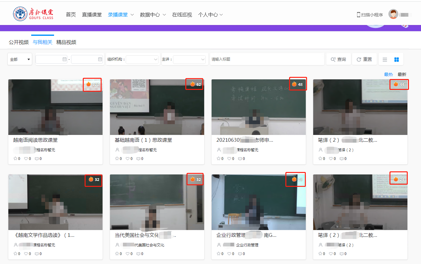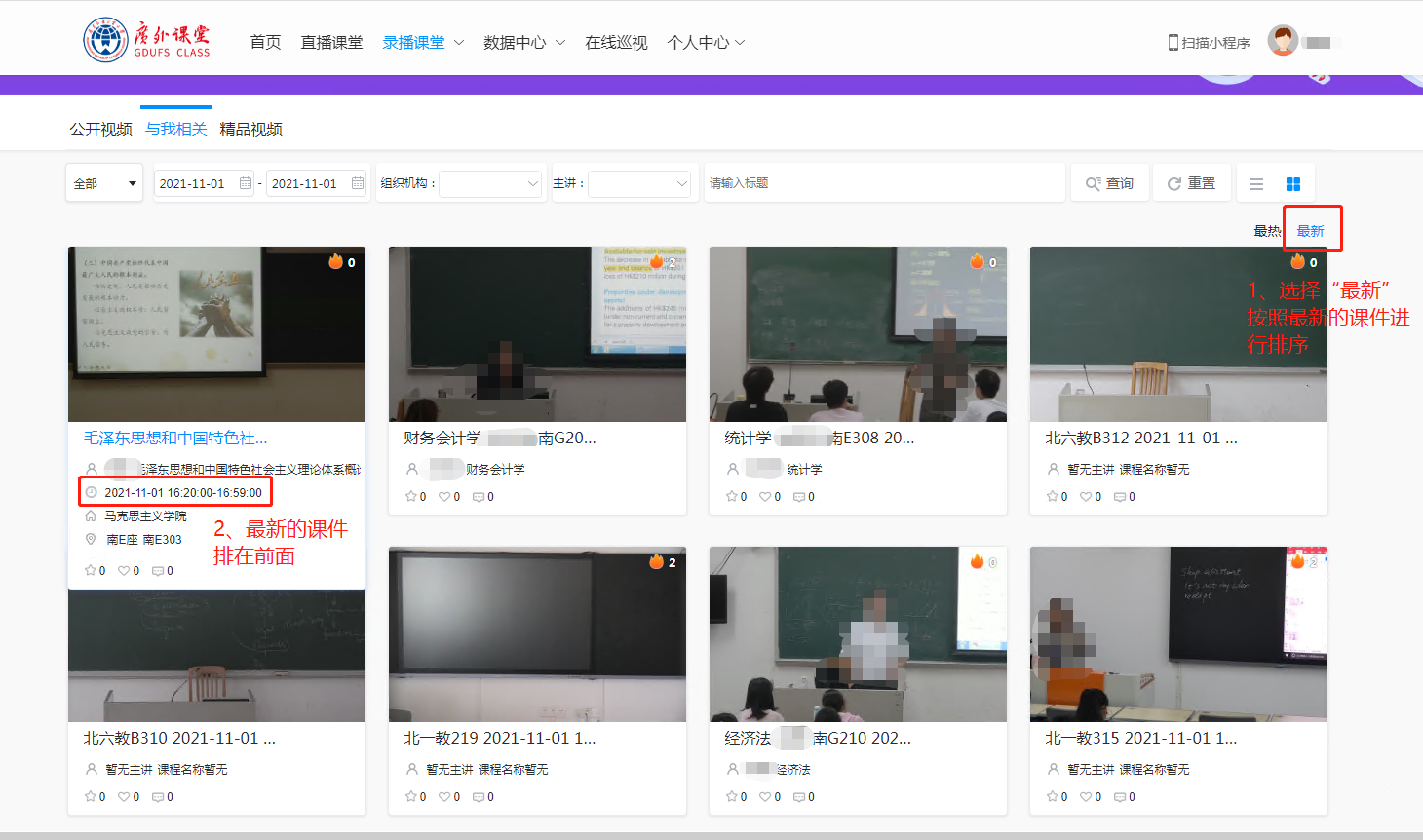 进入到“录播课堂”后,可查看到已经录好的视频课件,视频课件默认是按照“热门观看”的先后顺序排列,最多人观看的排在最前面;可以点击右边的“最新”,则会按照最新的课件进行排序;
