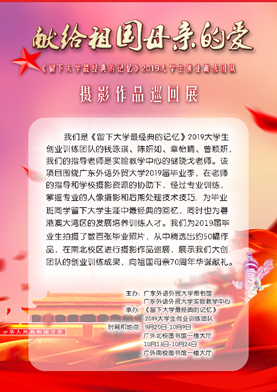 由校宣传部和校图书馆,以及实验教学中心的联合主办,《献给祖国母亲的爱》摄影作品展将从9月20日到10月24日在南北校图书馆进行巡回展出。作品主要展示了2019届本科和硕士毕业班同学们身穿正装,手持毕业证书和论文留下他们大学时代最经典的一刻。这个摄影展是由中心”《留下大学最经典的记忆》2019大学生创业训练团队”的同学们承办,用她们创业训练的成果向祖国母亲70华诞的献礼。