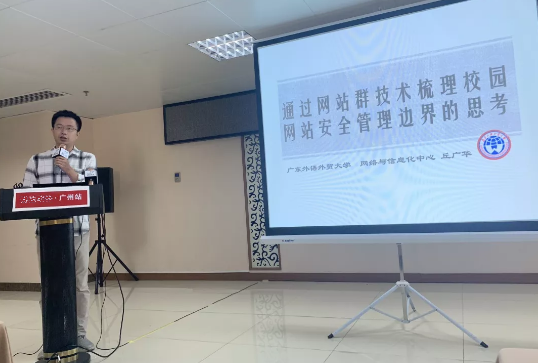 广东外语外贸大学网络与信息化中心丘广华发言主题《通过网站群技术梳理校园网站安全管理边界的思考》。发言从教育行业信息安全形势、校园信息安全风险的本质、网站群实现的支撑与管控、广外网站群建设情况分析以及未来校园网站运维的思考五个方面与大家分享在校园网站安全管理边界的思考与感悟。
