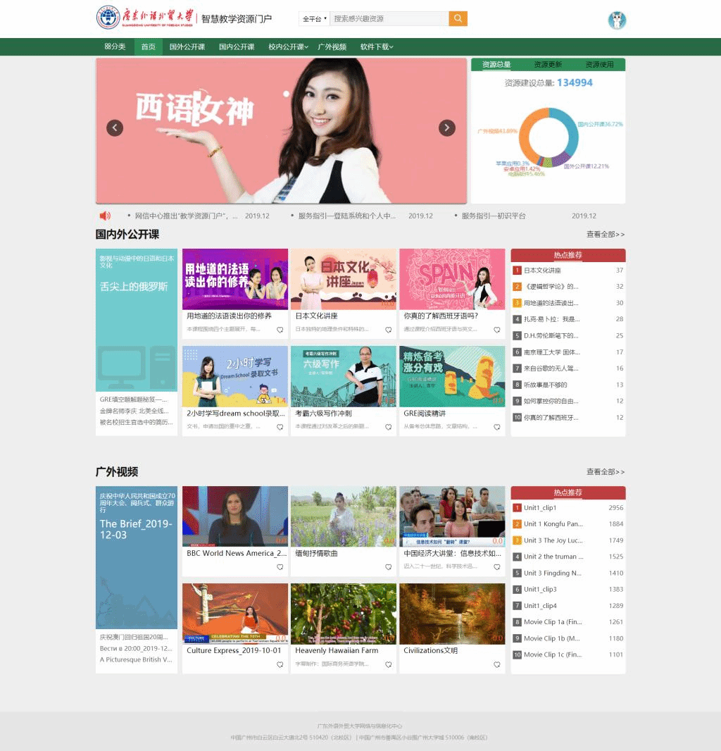 目前该门户提供了海量的云端资源,包括国内外公开课近7万个,PC端、安卓APP等经过安全检测无插件的公开软件近万余。同时还整合了我校已有的广外视频、在线课堂中心、正版软件下载中心以及即将上线的广外课堂等多套资源系统。门户将为广大师生提供更为优质的资源服务,为您带来由 “专用资源服务”向“大资源服务”转变所带来的优质体验。