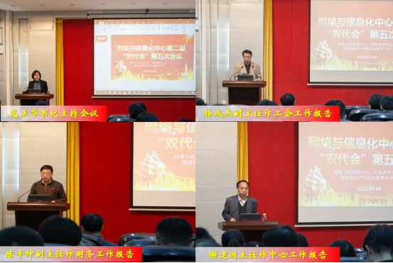 2020年1月6日上午,网络与信息化中心、实验教学中心、国家级同声传译实验教学中心第二届“双代会”第五次会议在北校区七教水上报告厅召开。副主任杨成杰作中心工会工作报告,副主任陈平仲作中心财务报告,中心主任谢建国作中心工作报告。大会由中心党总支部书记范正华主持,中心全体教职员工参加会议。