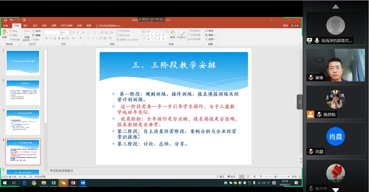 晏再庚和陈开华分别介绍了“约创云”和“汉得沙盘”两个电子沙盘的详细情况,分享使用该平台进行课程教学心得。崔雷总结《企业行为模拟(校内实习)》在线教学存在问题与困难并提出了解决思路和对策。一是要及时了解学生的学习情况、注重师生交流和灵活安排课程教学计划以应对电子沙盘资源不足是关键。二是要开展“约创云”和“汉得沙盘”等电子沙盘的课程培训,以帮助教师尽快适应从传统手工沙盘转换到电子沙盘的教学方式。三是如何提高学生的课程参与度和积极性是《企业行为模拟(校内实习)》在线教学的难点。学生地理位置分散、交互沟通粘合度不强,“约创云”平台规则丰富,入门较难,具有时间流程不可逆的特点。要求更注重运营规则、操作规范和“角色”间的合作协调。