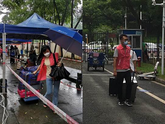 这已是中心党员同志第二次参加学校疫情防控志愿者工作。上学期末,中心党员同志参加了毕业生返校疫情防控志愿者工作。新学期伊始,中心党员们再次投入师生返校疫情防控服务工作中,共有9名党员同志报名参加新学期师生返校志愿者服务工作,他们或顶着酷暑、或风雨无阻,热情地为返校学子提供服务和引导,为家长排忧解难,与其他志愿者们成为校园里一道亮丽的风景。