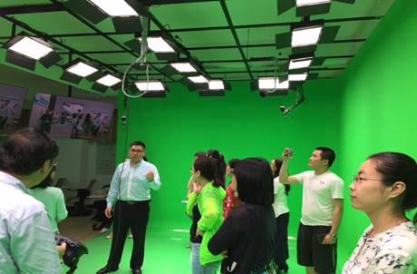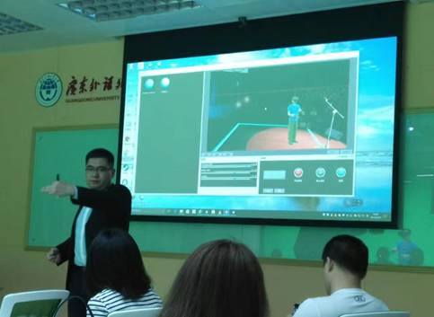 在进行报告和研讨前,古煜奎首先带领大家参观了外语虚拟仿真实验室,对实验室的四大功能进行了详细介绍:情景教学、微课拍摄、VR实训和自动录播,并就实验室服务教学、服务科研和服务社会三大功能做了进一步的介绍。大家对这一全新的外语虚拟仿真实验室表现出浓厚的兴趣和热情,并亲身体验了实验室的虚拟场景教学和VR实训功能,对其在未来外语教学中的应用前景给予了较大的肯定。