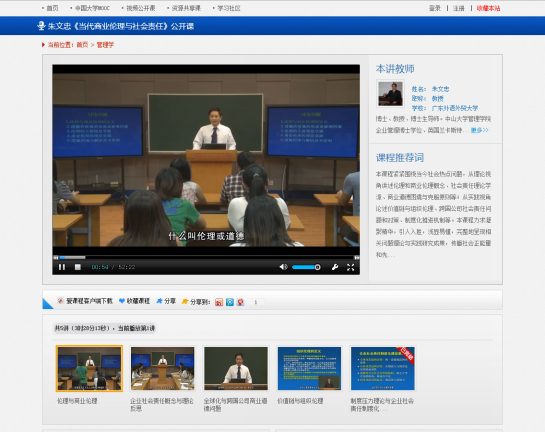 日前,接教育部下发的《关于公布第八批“精品视频公开课”名单的通知》(教高厅函[2016]15号),我校朱文忠教授主持的《当代商业伦理与社会责任》课程被认定为教育部第八批“精品视频公开课”,实现了我校国家级精品视频公开课零的突破。