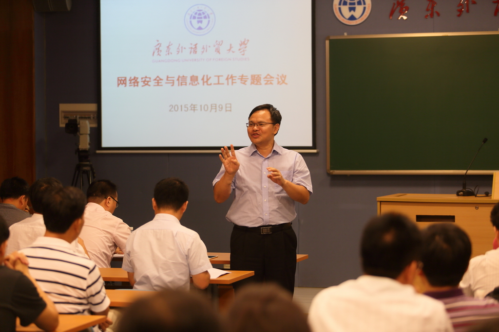 10月9日下午,为贯彻落实《关于印发全省高校网络安全保护工作电视电话会议工作任务书的通知》(粤公通字[2015]123号)精神,大学网络安全与信息化工作专题会议在白云山校区六教A209室举行。会议由刘建达副校长主持。校党委书记隋广军、各教学单位、科研机构、机关各部处及教辅单位主要负责人,学校网络安全与信息化工作领导小组及办公室成员出席会议。