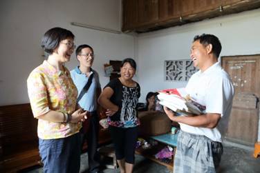 在我校驻黄坌村的干部郑安振和村委干部的协助下,大家深入了解帮扶户目前的生活、生产情况、存在困难以及今后的规划,并鼓励他们从实际出发,以扶贫开发“双到”为契机,鼓足干劲谋发展,努力脱贫致富。为了鼓励帮扶对象家庭中的学龄儿童努力读书,在为他们送上慰问金的同时,中心还为每户带了募捐的书籍。帮扶户对于中心给予的关心和慰问表答了衷心的感谢,并表示会再接再厉,力争早日脱贫致富。