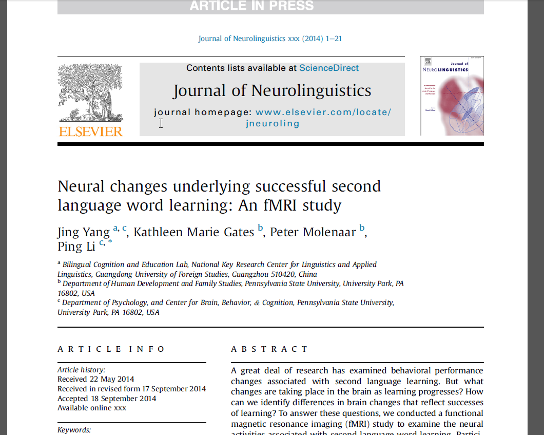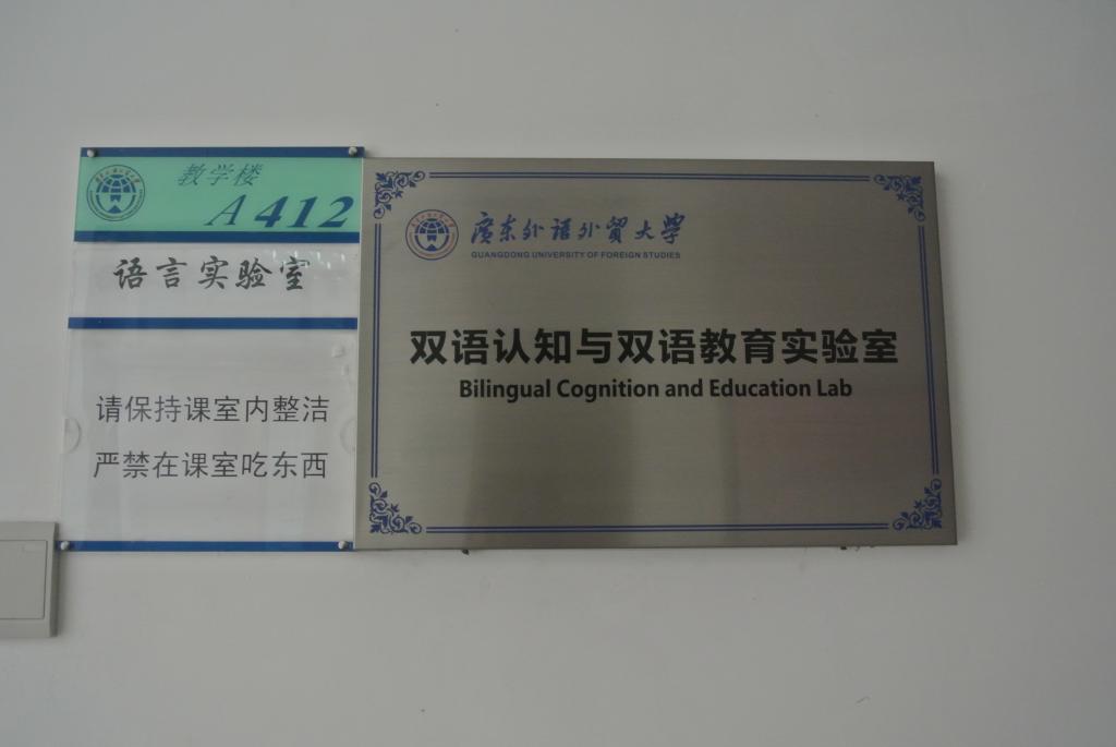 “双语认知及双语教育实验室”,原名“脑与语言实验室”,于 2012年建设并正式挂牌,同年顺利通过广东省211重点工程实验室验收。实验室根据自身的优势和国内外学科发展布局及趋势,明确了“双语认知与双语教育”的研究重点。我校引进的第一位“云山青年学者”杨静博士,与学校原有的两位从事神经语言学和心理语言学的教授组成团队,连同其他青年教师和一批博士生、硕士生形成一股合力进行大脑语言领域的研究。2014年,杨静博士和李平教授在国际语言类顶尖刊物上发表了关于第二语言词汇学习成功者的脑活动变化的论文,成为学术界响亮的“广外好声音”。另一位美籍研究员Kalim Gonzales 2015年初在心理学国际核心期刊发表有关婴儿双语学习的成果也引发学术界高度关注。