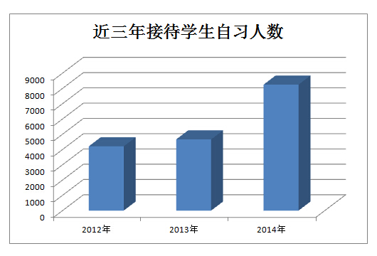 本年度实验室开放种类有:视听说实验室、同声传译实验室、笔译实验室和数字化语言实验室四个种类,几乎涵盖北语言日常教学的各个种类。晚上及周日开放天数约150天,近三年分别共计接待自习学生人数为4208,4662,8250余人,2014年度平均每晚自习学生人数约55人次,比去年同期增长了77%。