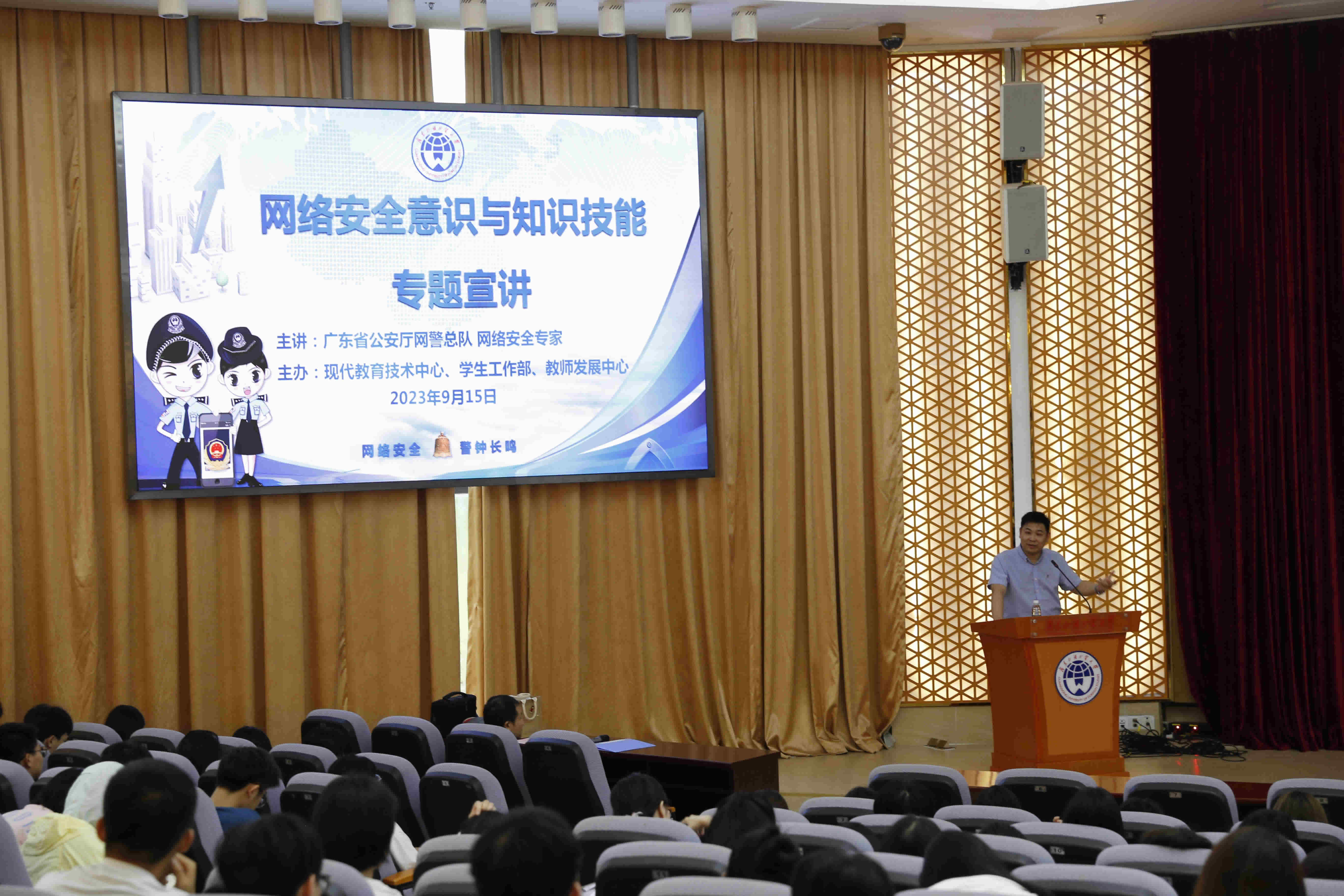 2023年国家网络安全宣传周于9月11日至17日在全国范围统一开展。为了进一步丰富“网络安全进校园”活动内容,现代教育技术中心、学生工作部、教师发展中心共同邀请网信、公安等部门网络安全专家,于9月14日在白云山校区、9月15日在大学城校区成功举办两场“网络安全意识和知识技能”专题讲座。讲座由现代教育技术中心娄会东主任、廖信海副主任主持,学生工作部赵观音副部长、叶开副部长和相关工作人员、师生代表出席参加。