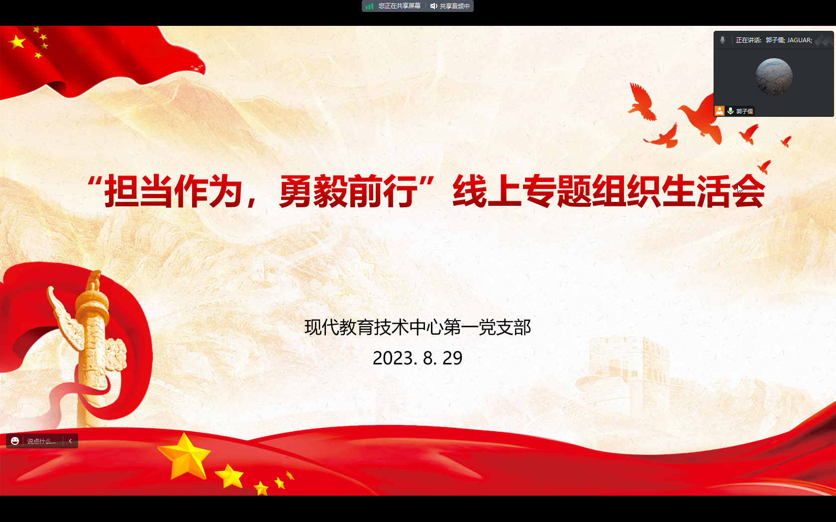8月29日下午,现代教育技术中心第一党支部通过腾讯会议线上开展“担当作为、勇毅前行”线上专题组织生活会。会议由支部书记郭子儒主持,中心党委书记何越晖和全体党员同志参加了本次会议。