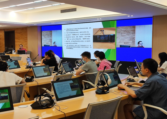 培训会上,主讲张庆有老师对同传实验室的功能进行全面介绍,就教师主操作台的使用功能、如何选中学生进行发音训练等实验室操作基本情况以及软硬件配套设施进行详细说明和指导,并向现场的教师介绍和演示同声传译设备的基本功能和操作方法,指出设备在使用过程中常见的问题及相应的解决方案。
