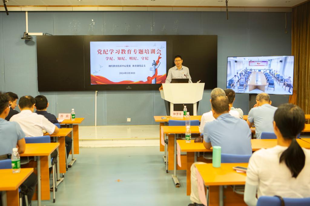 2024年5月30日上午,现代教育技术中心党委与体育部党总支在白云山校区六教A209和大学城校区实验楼D302联合举办以“深入研读并贯彻实施《中国共产党纪律处分条例》(以下简称《条例》),全面提升党员学纪、知纪、明纪、守纪能力”为主题的党纪学习教育专题培训会。会议由现代教育技术中心党委书记何越晖同志主持,体育部党总支书记钟罗军、体育部主任李旭武、教育技术中心主任娄会东、副主任丘广华等领导同志亦出席了本次会议。现代教育技术中心与体育部的全体党员均参与了此次培训会,共同学习并深入研讨了《条例》的相关内容。