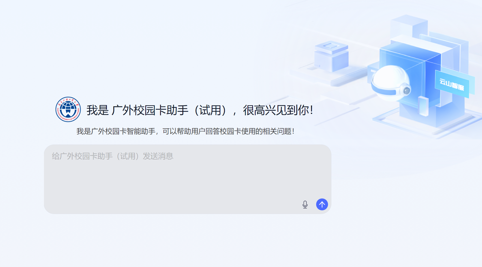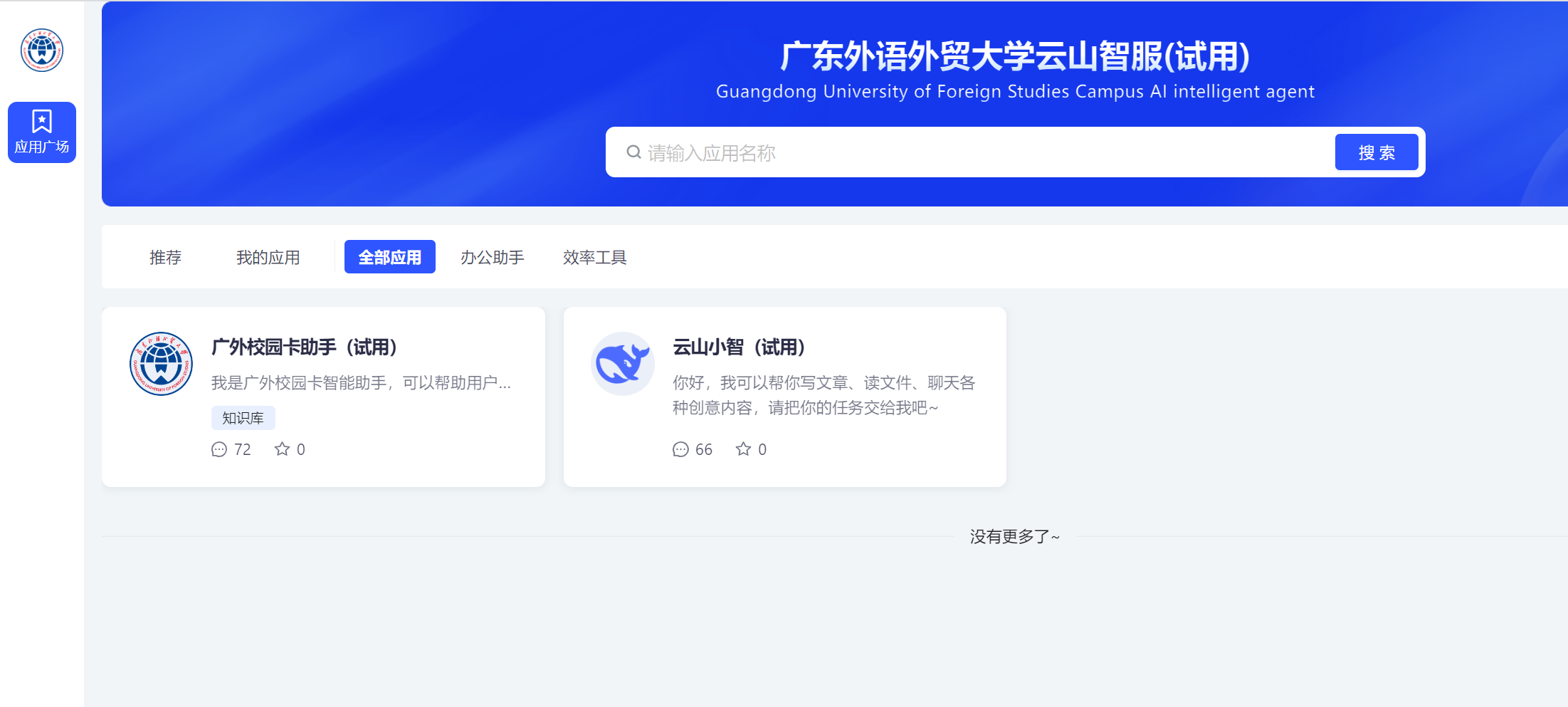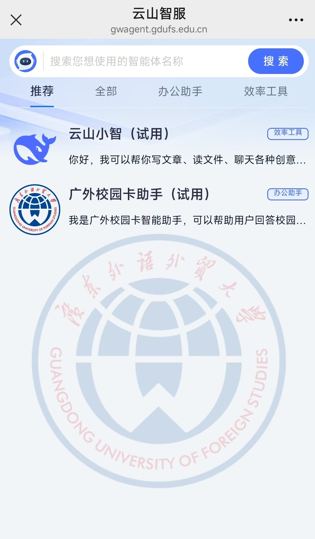 申请后,登录“智慧广外”-“应用中心”,点击“云山智服(试运行)”进入应用,账号将自动同步,管理员会定期进行授权。
