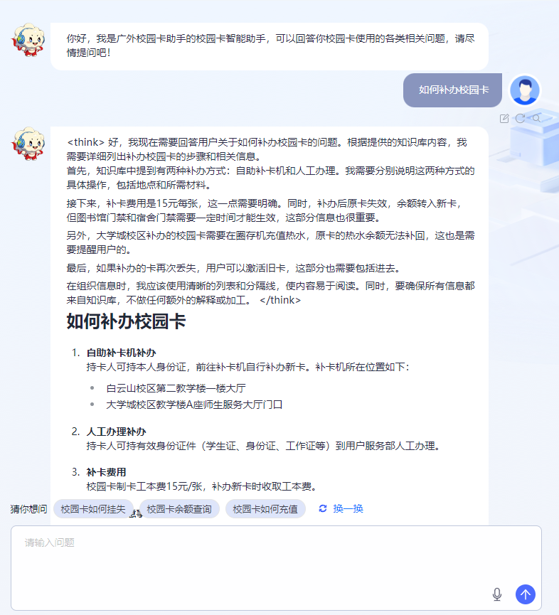 本地知识库、多模态交互、流程智能引导三大组件重塑校园服务新体验。第一,结合校园私有化知识库,各业务部门可上传本部门的政策文件,目前已支持“校园卡”“校园网”等高频服务问答的复杂问题解析;知识库将持续更新,确保信息的准确性和时效性。第二,支持文字输入、语音提问,满足不同使用习惯;回答内容支持嵌入网页、图片、链接和服务应用,提供了更加丰富的交互体验。第三,系统将陆续对接“线上办事大厅”多项服务,如“网络报修”“邮箱申请”等;问答系统可自动跳转至办理页面,并分步骤提示材料准备要点,实现网上办事的智能化引导,化身师生的办事“小助手”。